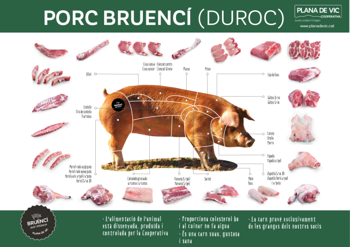 La carn de porc Bruencí que trobaràs als nostres establiments es divideix en: llom canya, llonzat centre, llom sencer, llonzat Girona, pluma, panxeta A/pell, panxeta S/pell, presa, filet, costella, tira de costella, xurrasco, pernil rodó amb pota, pernil rodó sense pota, pernil york s/pell i s/pota, pernil S/os 3D, cap de llom, galtes A/os, galtes S/os, careta, orella, morro, papada, papada s/pell, cansalada gruixuda a/cotna i s/cotna, secret, mans, peus, espatlla S/os 3D, espatlla, york s/pell i s/pota.