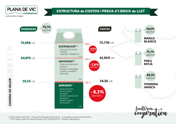 Les cooperatives de ramaders Plana de Vic i Vaquers d’Osona alerten del risc de col·lapse que viu el sector lleter per l’escanyament de les grans centrals distribuïdores de llet que imposen un preu per sota del cost de producció. Aquesta situació es dóna per la posició de dominància que té la indústria lletera que fixa el contracte amb preu, condicions i volum de vendes, amb un marge de negociació pràcticament nul per part del ramader. Per evitar aquest pols de força d’una de les dues parts i sustentada per les protestes de pagesos de diferents sectors, el Ministeri d’Agricultura, Pesca i Alimentació va aprovar el Reial Decret 5/2020 del 25 de febrer pel qual s’estableix que els contractes han de recollir el preu que cobreixi el cost mínim de producció. També va donar sis mesos per adaptar els contractes a la nova llei, termini que ja expirat per fer-se efectiu. Tanmateix, algunes centrals lleteres continuen fent-ne cas omís. Es tracta de les grans envasadores de llet que, en la immensa majoria dels casos, produeixen els brics per a marques de les grans cadenes comercials i algunes de les marques de llet més conegudes. Aquestes centrals al·leguen que és difícil saber els costos de producció i que el preu que paguen ara – que, en el cas de la llet fluctua segons l’oferta i la demanda i l’època de l’any, segons si hi ha més o menys volum de producció – ja cobreix els costos; una afirmació que no es fonamenta en cap dada empírica. És un cercle viciós perquè, al final, les cadenes de distribució per a qui produeixen les pròpies marques blanques també escanyen per fixar un preu a la baixa. A la fi, la cadena marca un preu mínim que ha de cobrir el procés industrial i envasat de la llet i, qui en rep les conseqüències, és el productor que ven per sota dels mínims.