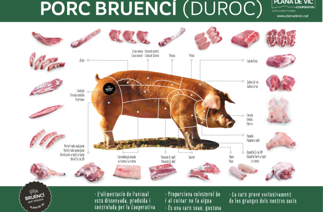 El nostre porc Bruencí és de raça Duroc. Prové de les granges de la Cooperativa Plana de Vic i està alimentat amb els millors cereals i lleguminoses seleccionats pels nostres experts en nutrició riques en vitamines i minerals. La seva carn és gustosa tendre i sana.